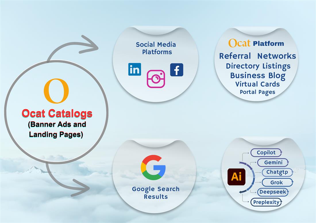 Ocat® Promote: helps businesses get discovered across search engines, social media, referral networks, Portals and AI assistants in US.